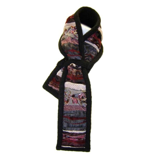 Svört þæfð ullar voð með rykktum kanti úr rauðleitu munstruðu efni með satín áferð.